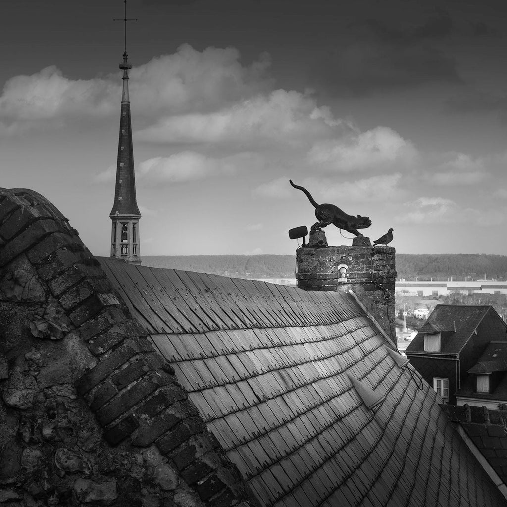 Le noir et blanc profond révèle l'histoire de ce lieu, autrefois l'Hôtel du Chat, avec son emblématique félin factice veillant sur les toits. Un pigeon audacieux, posé avec une ironie naturelle, ajoute une touche d'humour inattendue à cette scène chargée de mémoire. Une photographie élégante qui raconte une petite histoire avec humour.